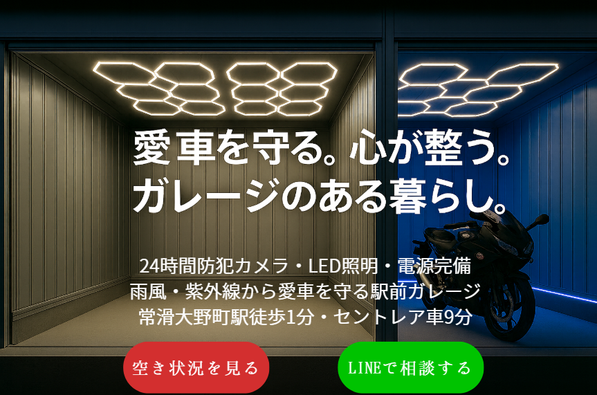 屋内ガレージ保管=再販価値・維持価値にも貢献します。屋外保管では、紫外線・酸性雨・潮風・黄砂・結露は、塗装・ゴム・金属・電装に“静かなダメージ”を与え続けています。