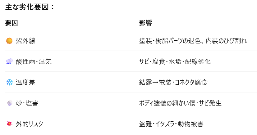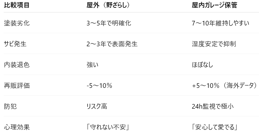 AZ Detailing(米国自動車保管専門社)**による調査では、屋内保管は「温度・湿度・紫外線変動を最小化し、塗装・ゴム・金属部品の劣化を遅らせる」と報告。→ 特に「海沿い・日射の強い地域」では効果が大きい。とされています。